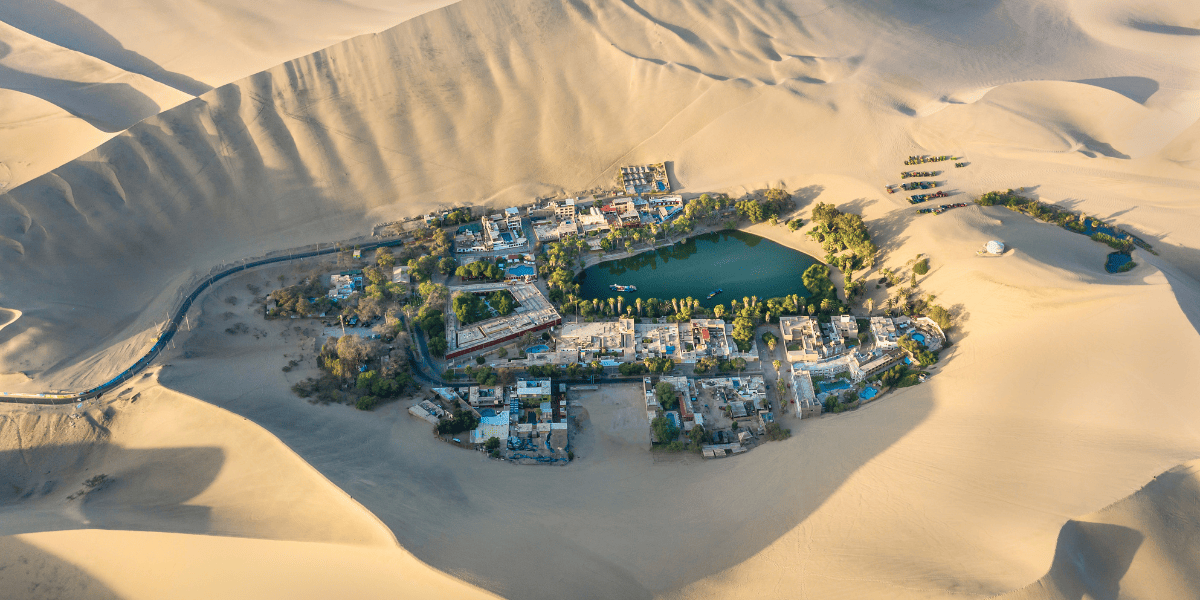 Huacachina oasis surrounded by sand dunes
